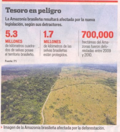 RÍO DE JANEIRO.- Bajo la presión del poderoso sector agropecuario, la Cámara de Diputados de Brasil aprobó en la madruga de de ayer una polémica reforma al Código Forestal que flexibiliza los controles sobre los bosques y selvas y otorga una amnistía a quienes realizaron deforestaciones ilegales hasta 2008.