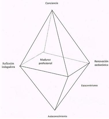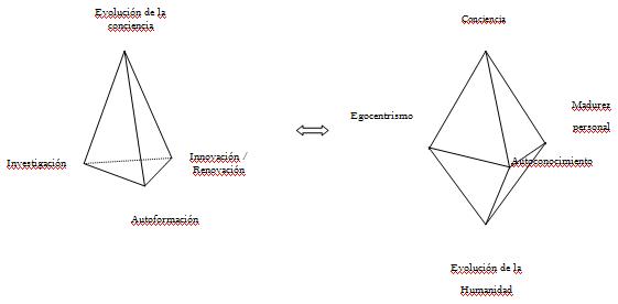 Nuestra propuesta de referentes formativos (Figura 1) añade la 'autoformación' del profesorado, comprendida como unidad indisoluble entre contexto, persona, proceso, resultado y sentido, que tiene lugar en términos de complejidad de conciencia evolutiva. Se genera así la posibilidad de actuar desde el tetraedro de vértices: ‘investigación-innovación-autoformación-evolución de la conciencia', que aporta, respecto a la 'investigación-innovación-enseñanza', una diferencia en complejidad y en repercusión didáctica considerables.