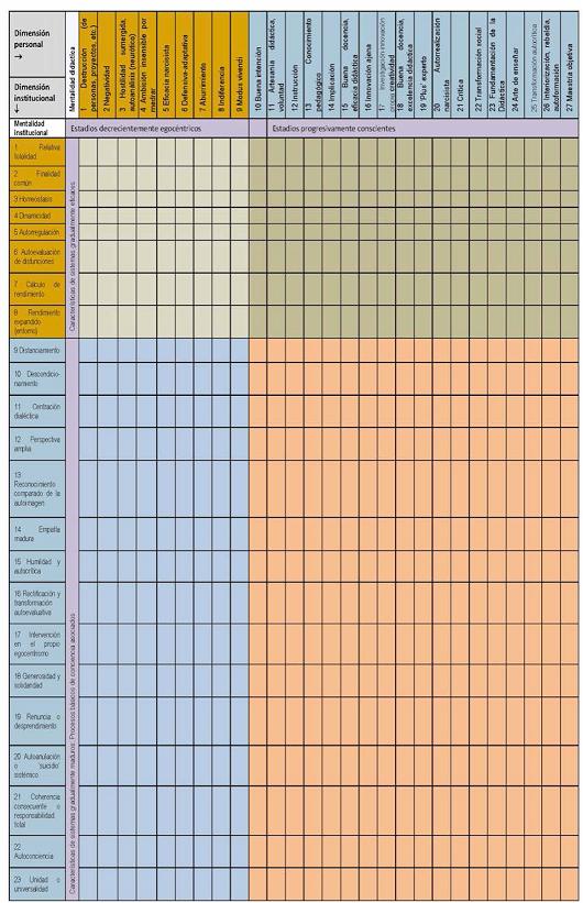 En la naturaleza, p.ej., la profundidad del océano es duradera y estable. Su superficie en cambio es fugaz, móvil, variable, y lo que en ella sucede se lo lleva el tiempo antes. La formación, como la alta creatividad, se desarrolla mejor en lo profundo. Por eso la epistemología y la hermenéutica que aplicamos tienen que ver con la profundidad de la Didáctica, con lo que hace que la ciencia se mantenga en pie y pueda desarrollarse de dentro a fuera. Desde este marco funcional se propone un cambio radical en el enfoque de la reflexión: en vez de situarla en la práctica y en su mejora, se sitúa en quien practica y en su conciencia, desde la que a sí mismo y a su práctica observa. Desde ella será posible acceder a ámbitos más profundos o propios de la formación, con un claro correlato y efecto en la enseñanza: la conciencia, el egocentrismo docente, la madurez personal, el autoconocimiento y la evolución de la Humanidad (Figura 1). Respecto a ellos se desarrolla una tesis de dos caras: