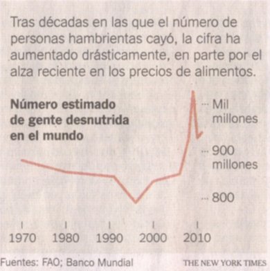 El reciente repunte de precios ha ayudado a provocar el mayor incremento en el hambre mundial en décadas. La Organización para la Agricultura y la Alimentación de la ONU (FAO, por sus siglas en inglés), calculó que 925 millones de personas sufrieron hambre el año pasado y se anticipa que el número será más alto este año. El Banco Mundial señala que podría alcanzar los 940 millones.
