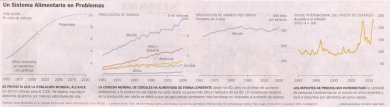 El consumo de los cuatro alimentos básicos que suministran la mayoría de las calorías humanas -trigo, arroz, maíz y soya- ha superado a la producción durante gran parte de la última década. El desequilibrio ha resultado en dos enormes repuntes en el precio internacional de los granos desde el 2007, en los que el costo de algunos granos aumentó a más del doble.