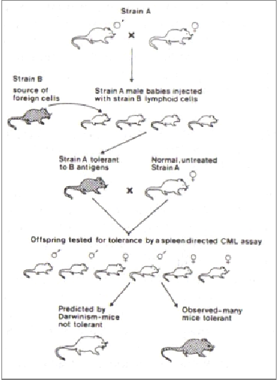 Steele comprobó que una parte de la descendencia de los individuos con los que trabajaba, nacían con capacidad de respuesta inmediata ante un antígeno que había sido inoculado a un parental con anterioridad. De hecho, la tolerancia a antígenos de otra cepa, que se puede conseguir al introducirlos durante los primeros días de vida del animal, se heredaba de forma incomprensible según la teoría de la barrera de Weissmann, según la cual la línea germinal y sómatica son totalmente independientes y, por lo tanto, es imposible la transmisión de caracteres adquiridos a la descendencia (figura adjunta 1, obtenida de “Lamarck´s signature”, Steele 1998).