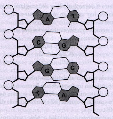 Figura 1. Representación esquemática de una sección de una molécula de DNA. Los círculos de los extremos representan las moléculas de fosfato, los pentágonos anexos son las moléculas del azúcar desoxirribosa. Juntas forman la parte invariante del polímero. Las sombreadas muestran la parte variable del DNA que son las bases nitrogenadas. Nótese que la A y la T se unen mediante dos puentes hidrógeno mientras que la C y G con tres. También hay que destacar que A y G son “grandes” mientras que T y C “pequeñas”.