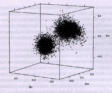 Figura 2: Representación en tres dimensiones del índice IDH (ver texto). La nube de puntos de la izquierda corresponde a la bacteria Agrobacter Tumefaciens y la de la derecha a la rata Ratus norvegicus.