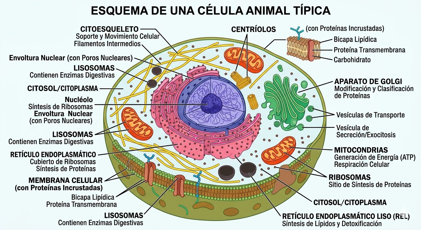 1.- Núcleo: El “cerebro” de la célula; regula el crecimiento y metabolismo celulares, alberga el ADN y controla las actividades celulares a través de la expresión génica.