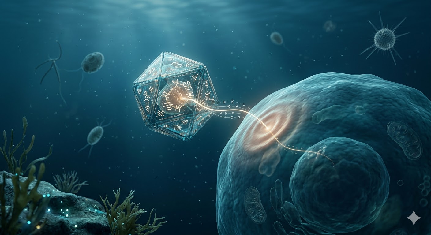 ilustración de los virus interactuando con las células, mostrando su presencia tanto dentro como fuera de las células. La imagen destaca el papel de los virus como microcomputadoras complejas que transportan y transmiten información entre células, así como su naturaleza antigua y ubicua, con referencias a plantas y animales primitivos en hábitats oceánicos.